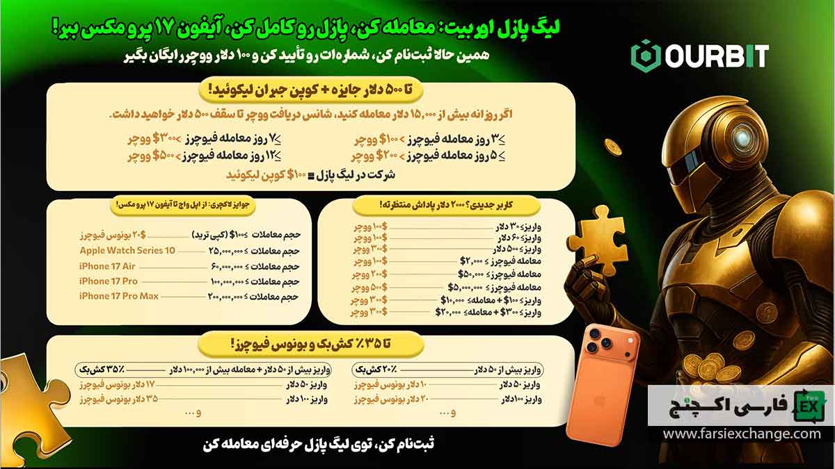 این بار با لیگ پازل اوربیت (Ourbit Puzzle League) فرصتی فراهم شده تا با معامله در بخش فیوچرز، پازلهای ویژه را تکمیل کنید و از جوایز نقدی، بونوسهای فیوچرز، کوپنهای لیکوئید و حتی آیفون ۱۷ پرومکس لذت ببرید!