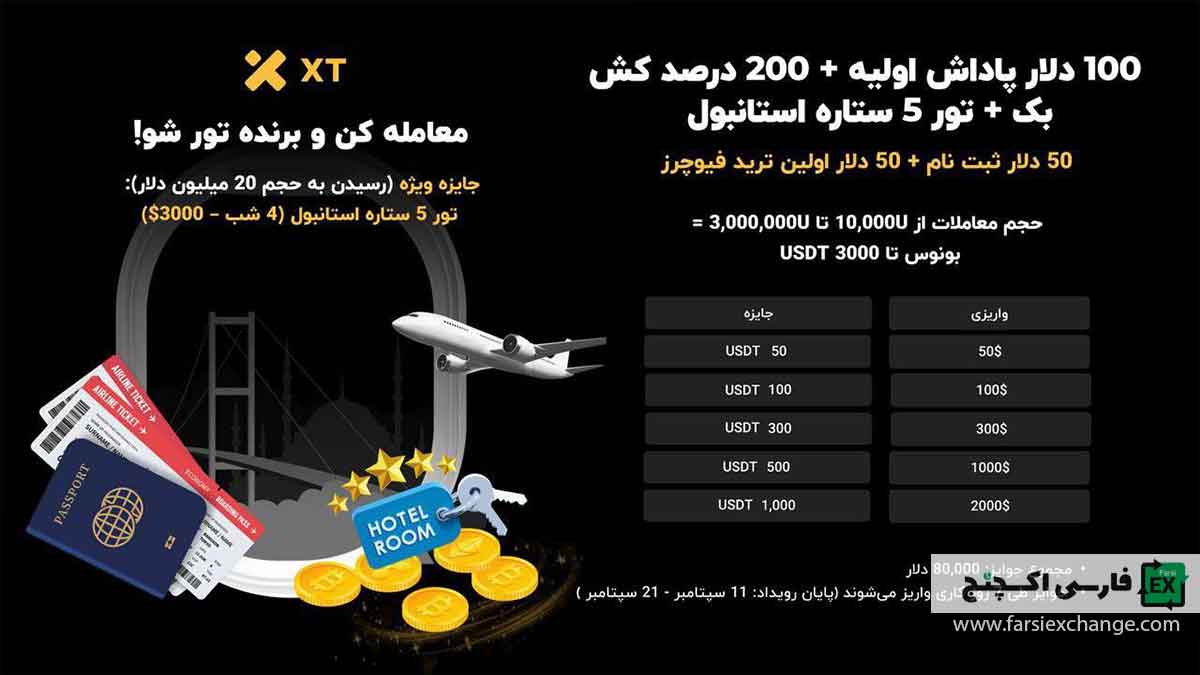 کمپین ویژه صرافی XT با 100 دلار پاداش اولیه + 200% کشبک + تور 5 ستاره استانبول